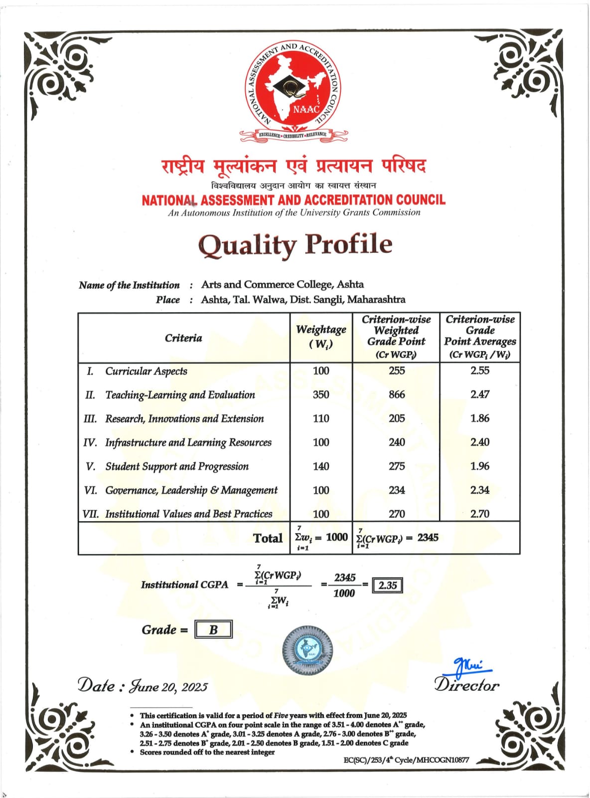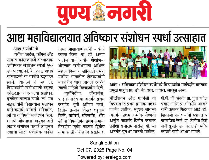Amidst the social unrest that marked the 1960s in Walwa tehsil, Loknete Rajarambapu Patil founded Arts and Commerce College, Ashta, in 1965—a visionary step towards peace and progress through education. It is permanently affiliated to Shivaji University, Kolhapur, signifying its sustained academic excellence. Spread across a spacious 42-acre campus, the college provides a conducive environment for academic excellence, extracurricular engagement, and overall student development, catering to both local and global educational needs.